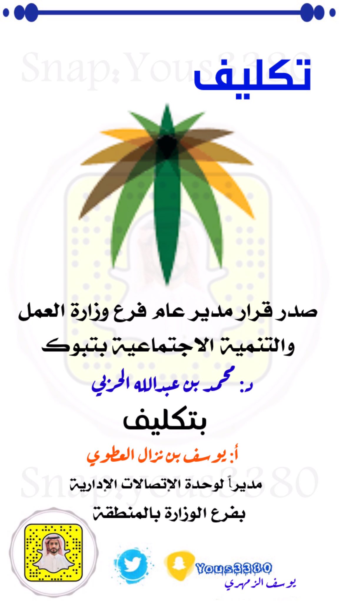 شبكة تبوك الاعلامية سناب اخبار تبوك On Twitter صدر قرار مدير عام فرع وزارة العمل والتنمية الاجتماعية بتبوك د محمد بن عبدالله الحربي بتكليف الاستاذ يوسف بن نزال العطوي مديرا لوحدة الاتصالات الادارية