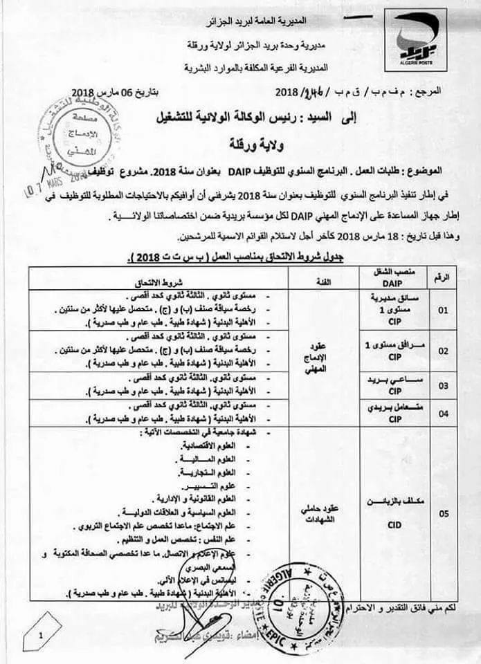 إعلان توظيف في بريد الجزائر لولاية ورقلة مارس 2018 مدونة التوظيف في الجزائر Dzemploi