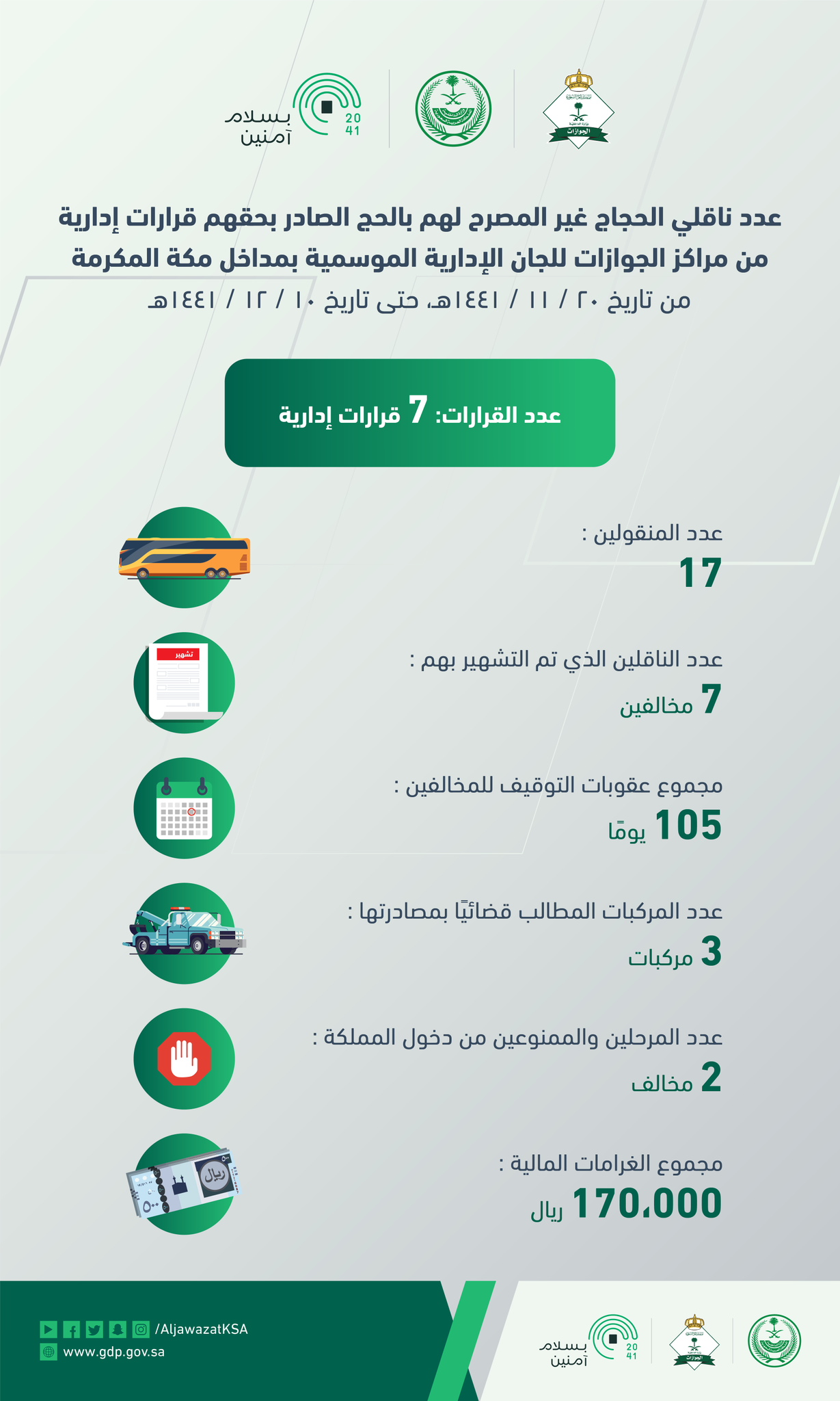 الجوازات السعودية On Twitter الجوازات تصدر 7 قرارات إدارية من اللجان الإدارية الموسمية في مراكز مداخل مكة المكرمة بحق ناقلي حجاج غير مصرح لهم بالحج بسلام آمنين Https T Co Uygwbqxfmd Https T Co Bbysxyml4e